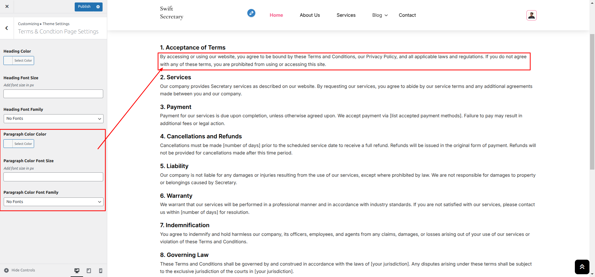 Go to Appearance >> Customize >> Theme Settings >> Terms & Condition Page Settings