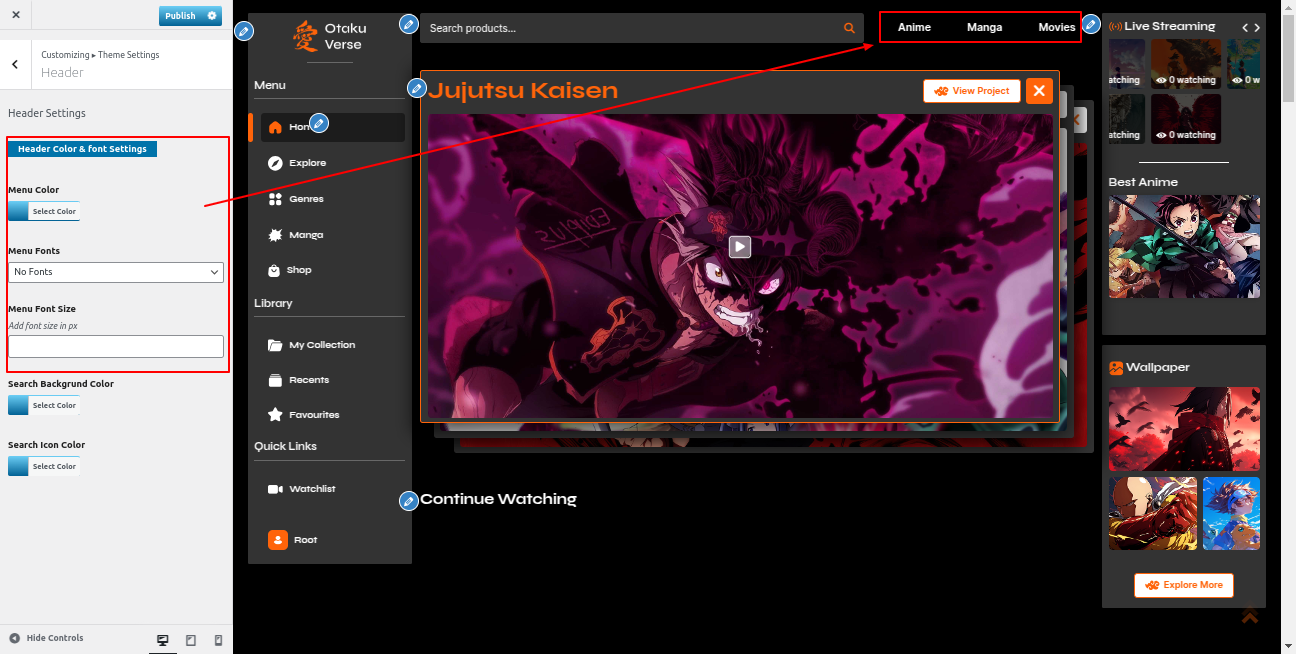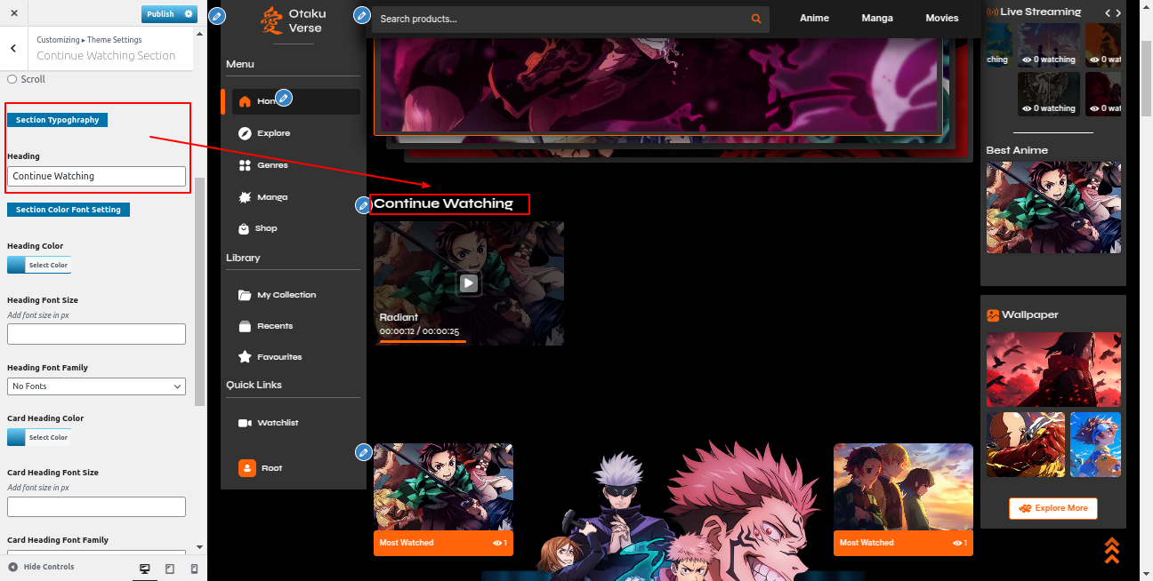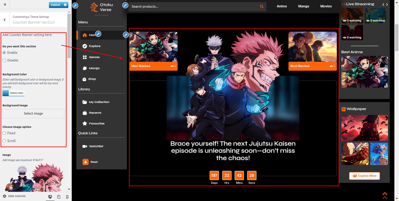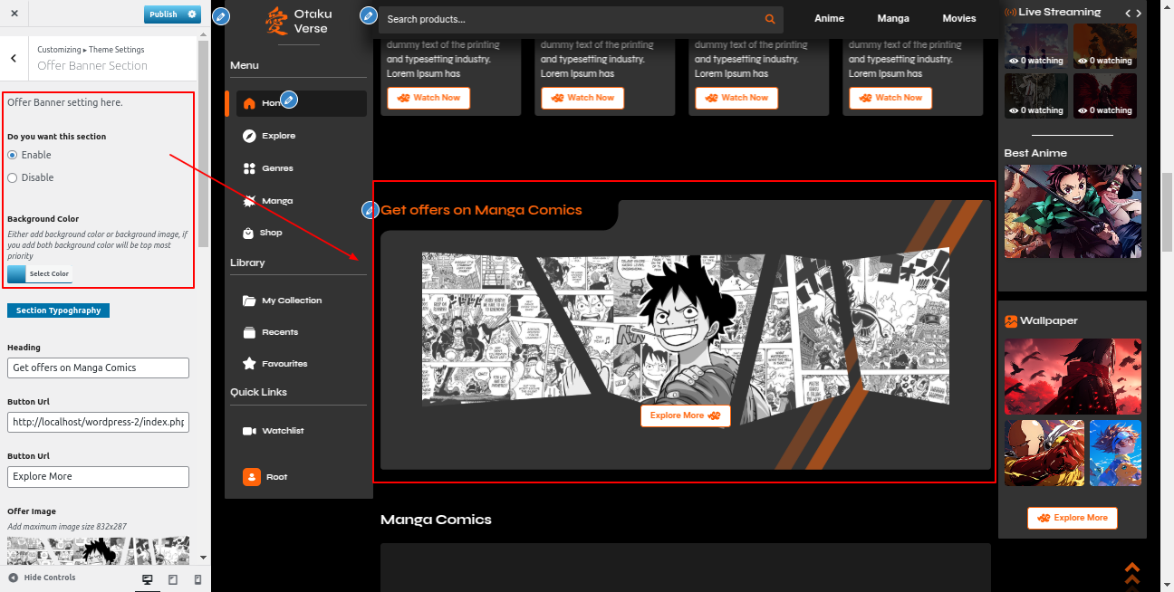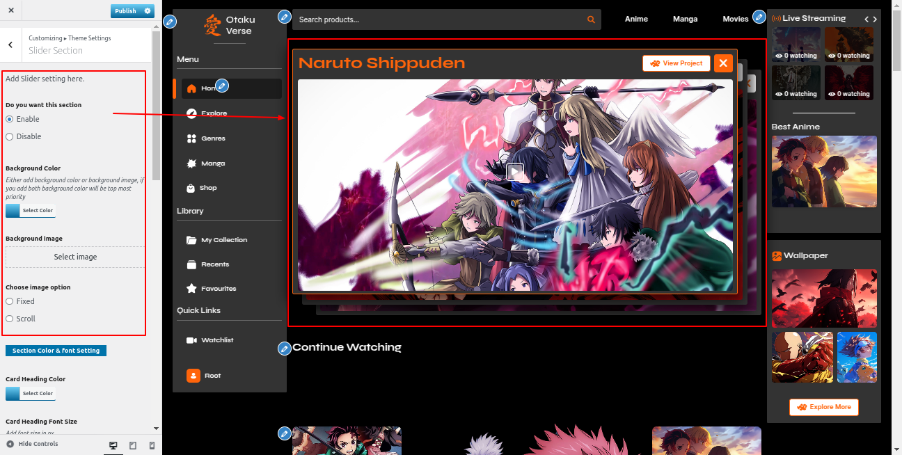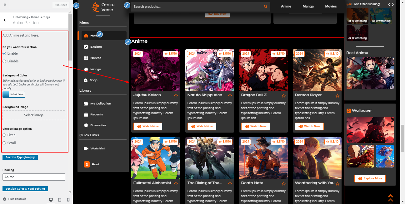 Go to the Appearance >> Customize >> Theme Settings >>Anime Section