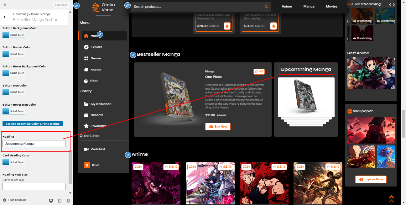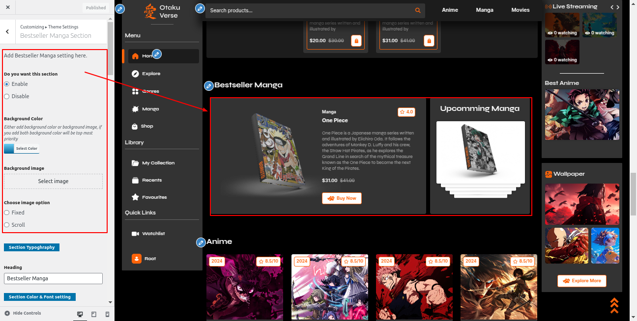 Go to the Appearance >> Customize >> Theme Settings >>Besteller Manga Section