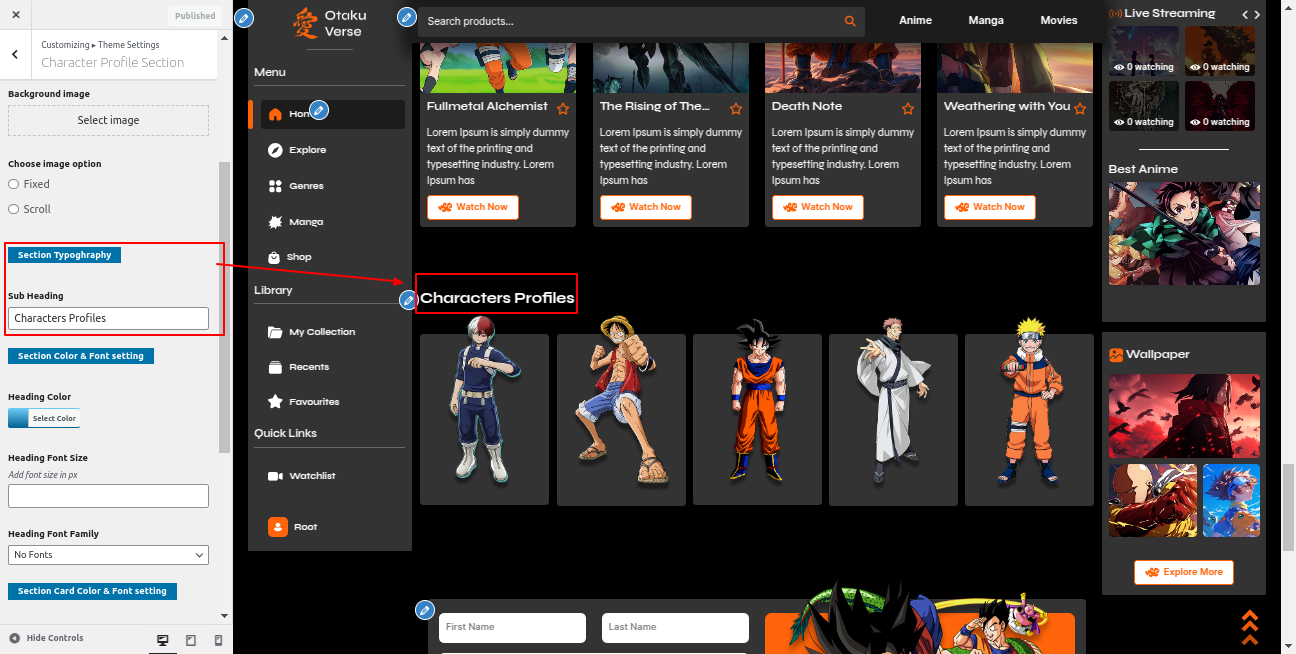 Go to the Appearance >> Customize >> Theme Settings >>Character Profile Section