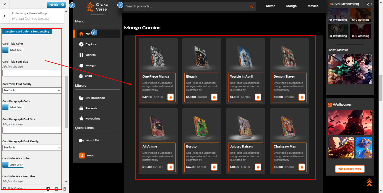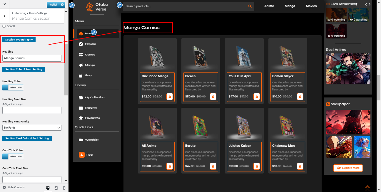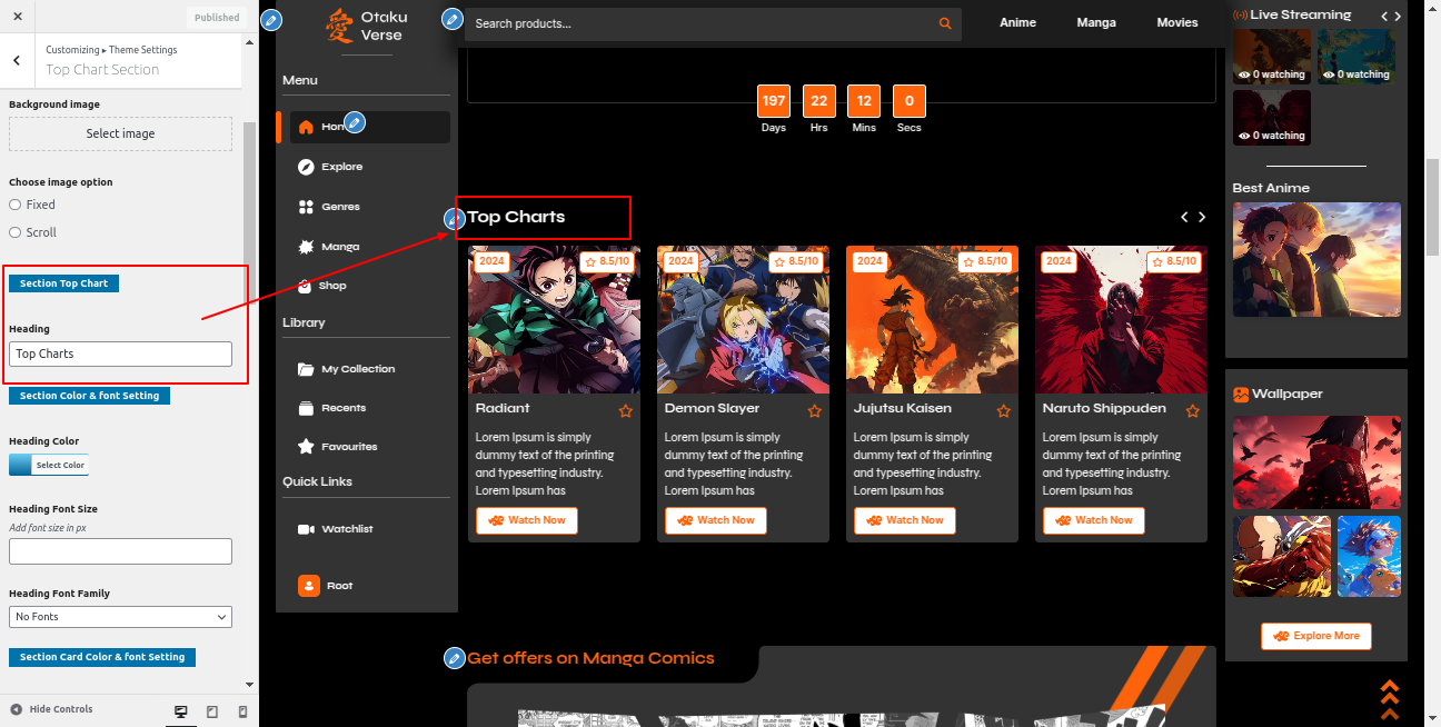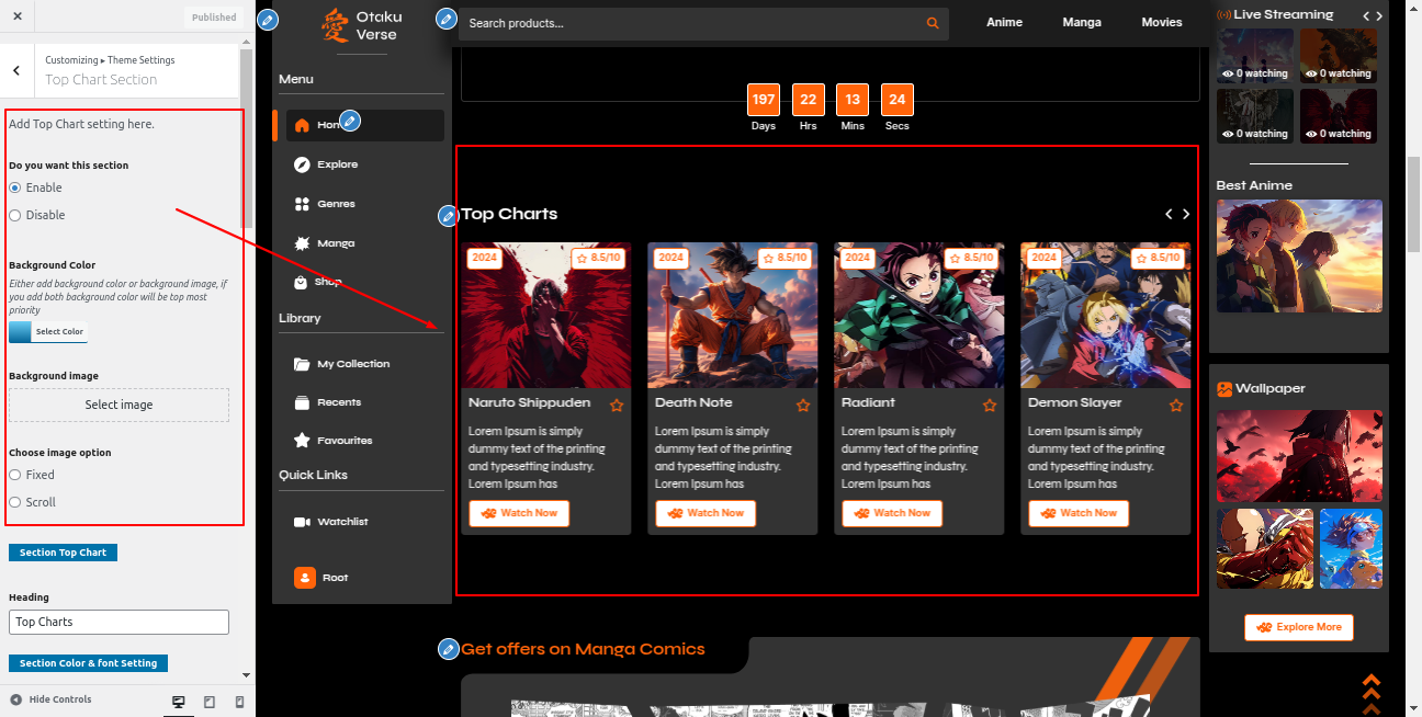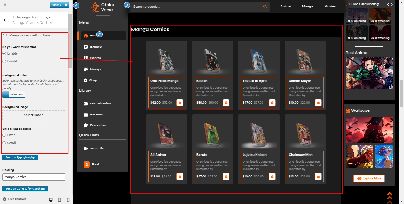Go to the Appearance >> Customize >> Theme Settings >>Manga Comics Section