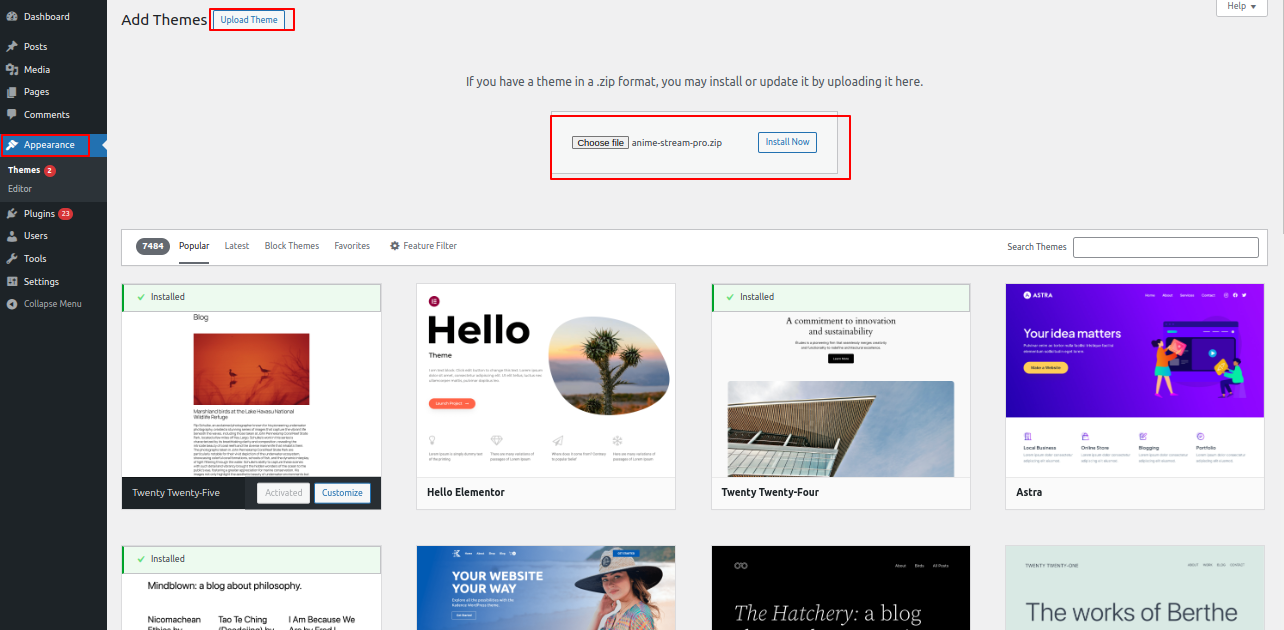 3. Press the "Upload Theme" button.