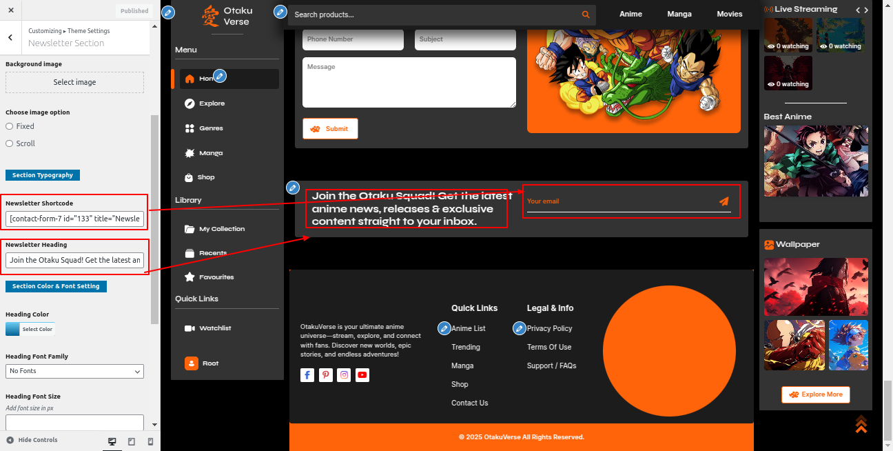Go to the Appearance >> Customize >> Theme Settings >> Newsletter Section
