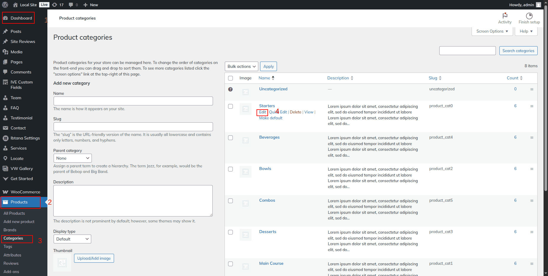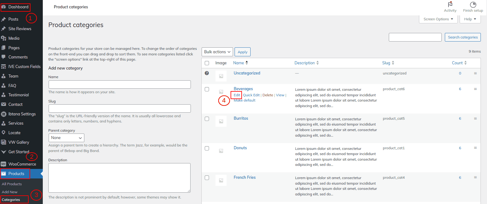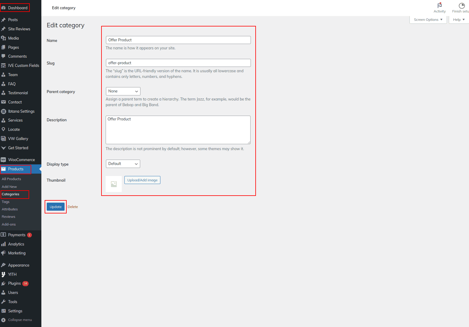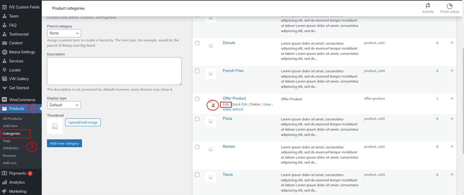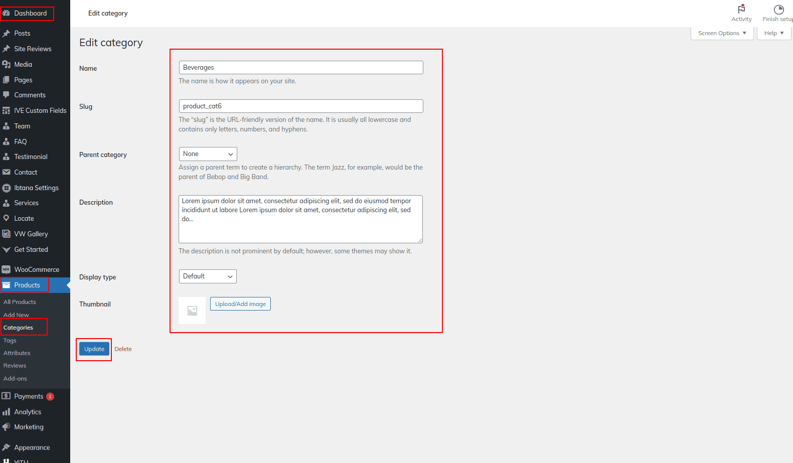 Go to Dashboard >> Products >> Categories >> Edit