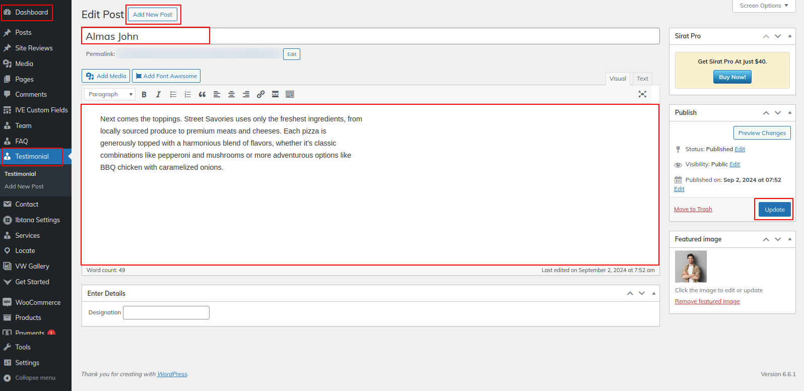 Go to Dashboard >> Testimonials >> Edit