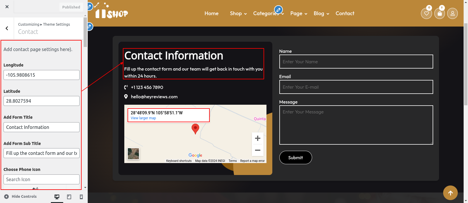 Go to Appearance >> Customize >> Theme Settings >> Contact Page Section