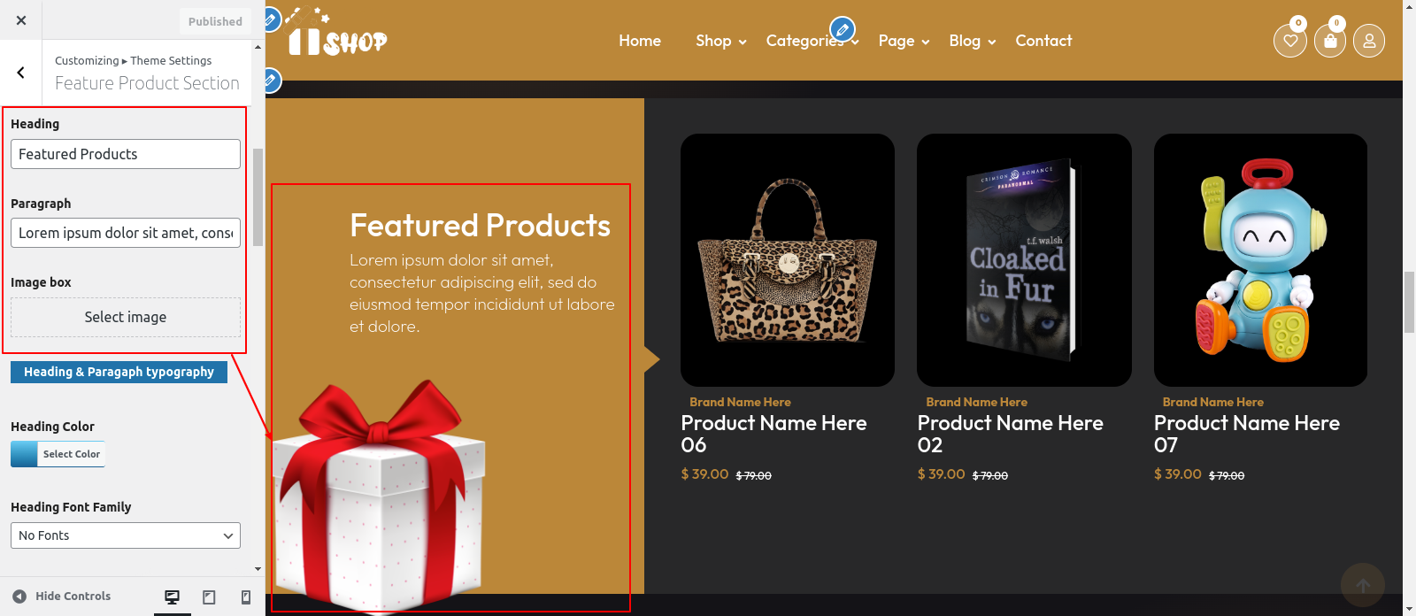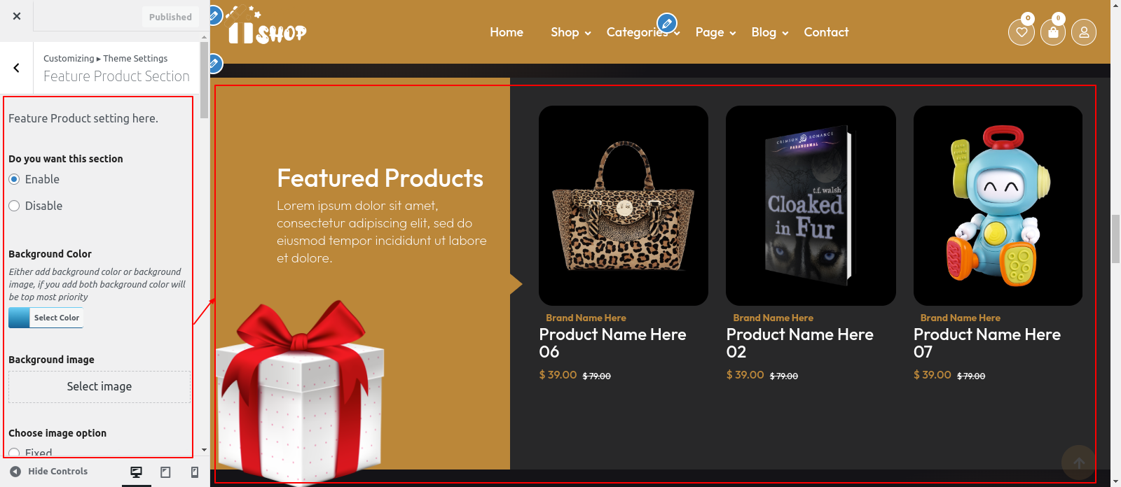Go to Appearance >> Customize >> Theme Settings >> Feature Product Section