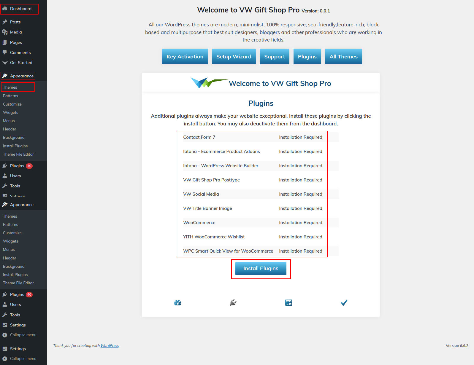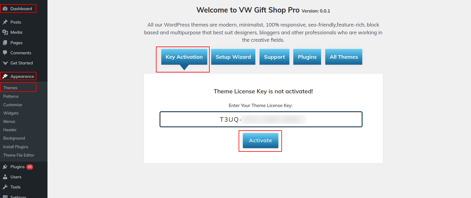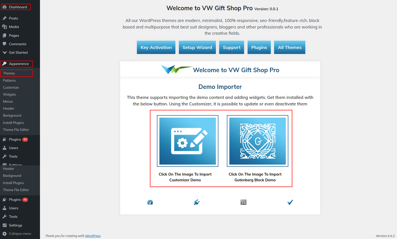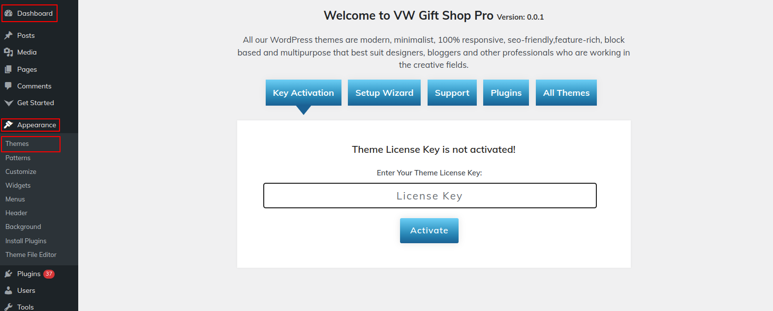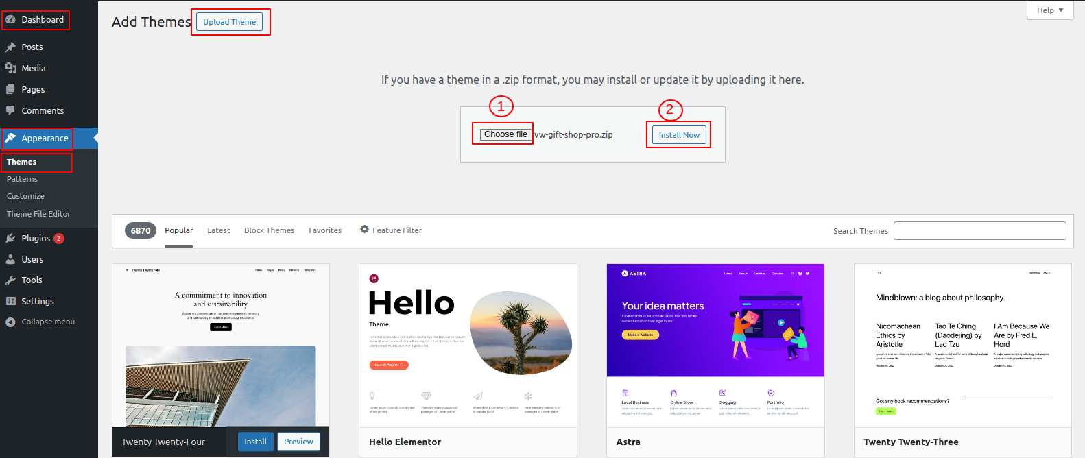 3. When arriving at the themes page, click on the Upload Theme button at the top and upload zip file (vw-gift-shop-pro.zip)