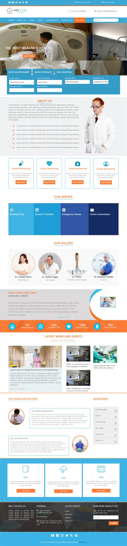This premium hospital wp theme is fully responsive, multipurpose, has cross-browser compatibility and works insanely fast across all platforms this theme come with a special query section, book an appointment. Advanced search options, blog posts, featured specialist sections, testimonials, news & event segment, and doctor’s tip segment.